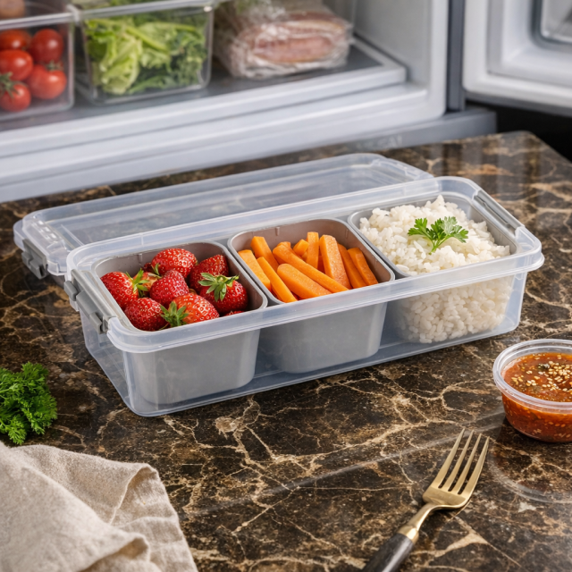Практичний прямокутний контейнер з трьома окремими секціями для зберігання різних продуктів без змішування.